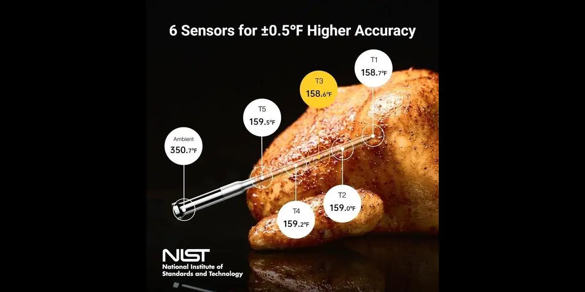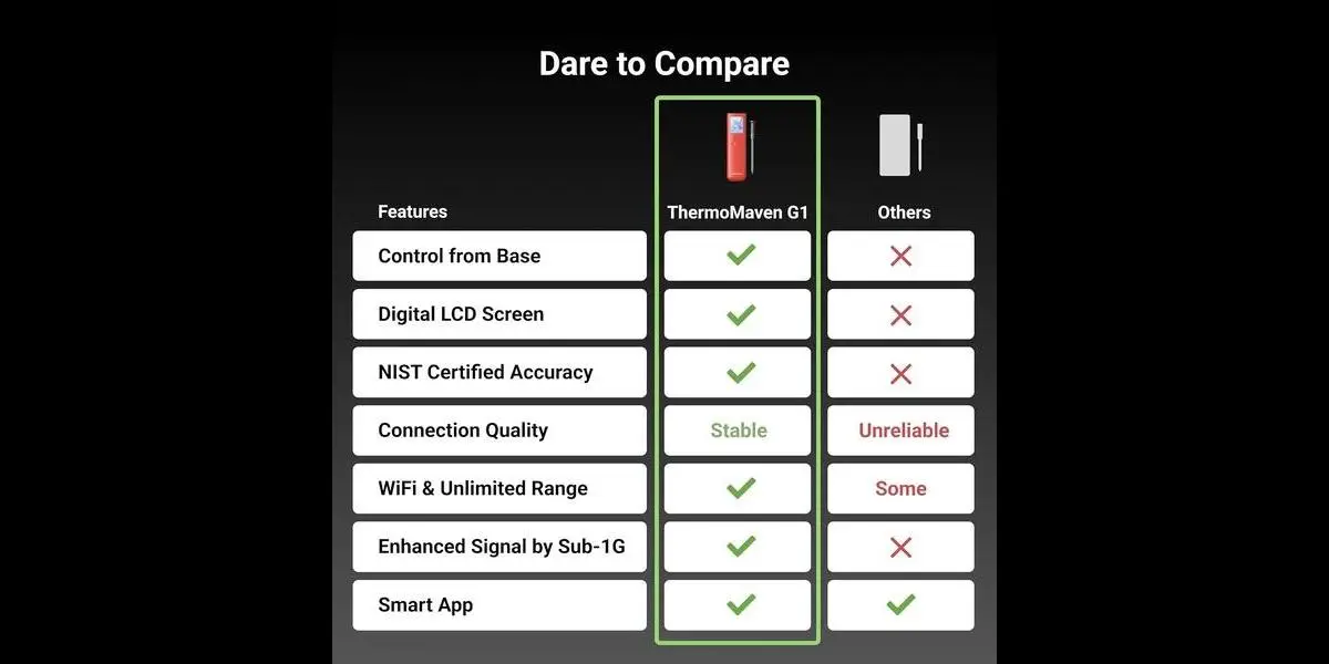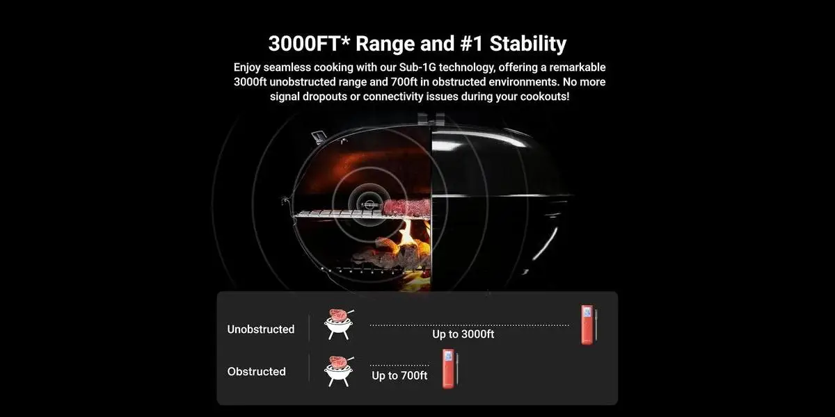 Featuring a standalone digital display base and Wi-Fi + Bluetooth connectivity, the ThermoMaven lets you monitor your food’s temperature in real time from anywhere — no constant checking or guesswork required. Its enhanced Sub-1G signal stability maintains strong connections up to 3,000 feet, making it perfect for grilling outdoors, smoking, roasting, or oven cooking.
