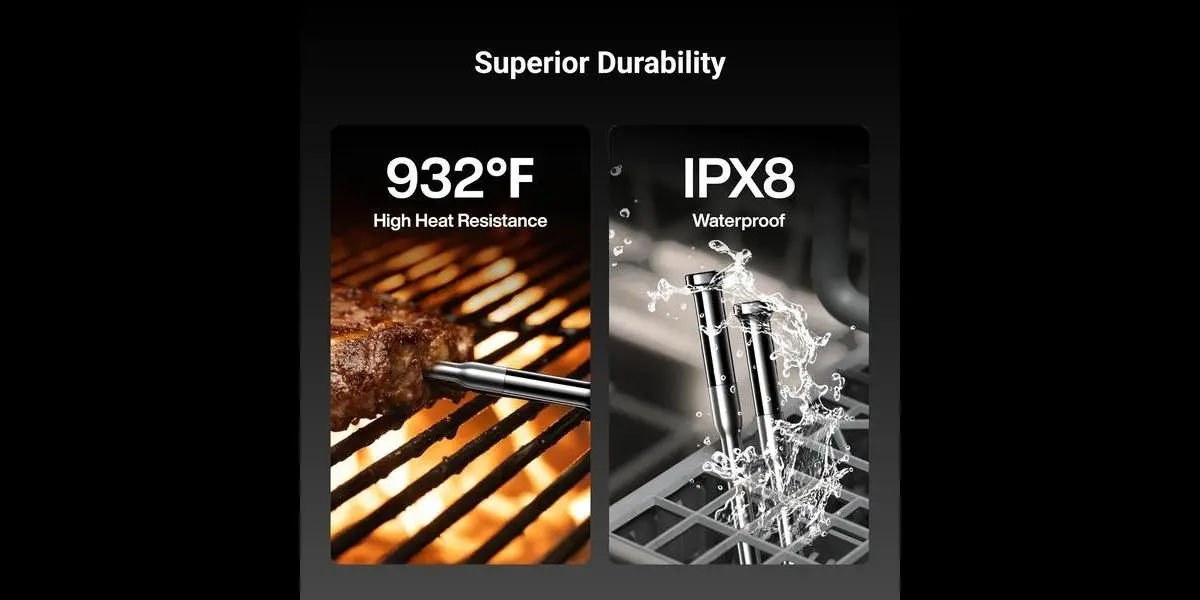 - Probe Durability: Heat-resistant up to 932°F, IPX8 Waterproof